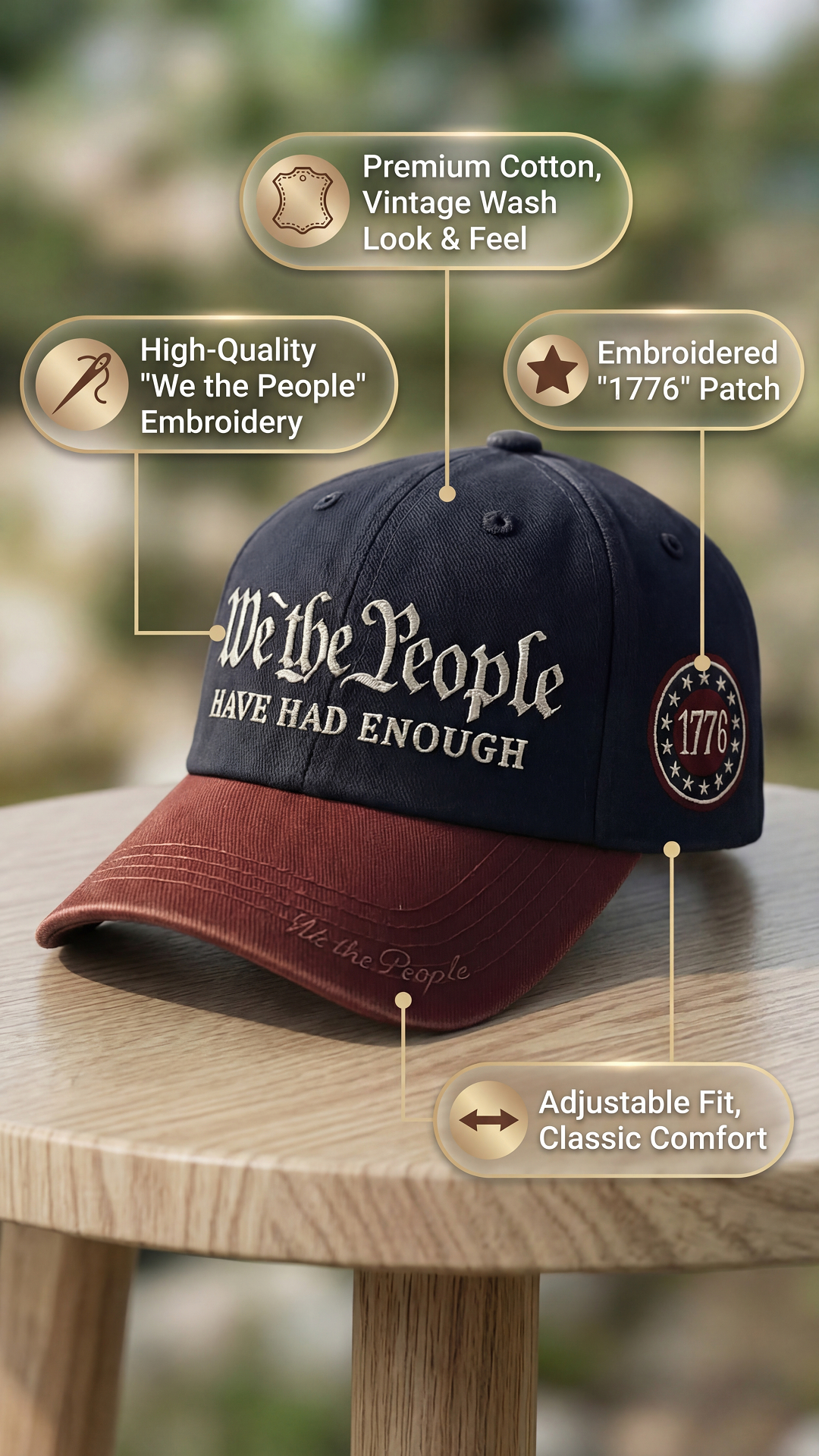 🧵Made with high-quality cotton fabric, reinforced stitching, and a structured crown for durability and long-lasting shape. The detailed 1776 side patch adds a heritage-inspired touch.