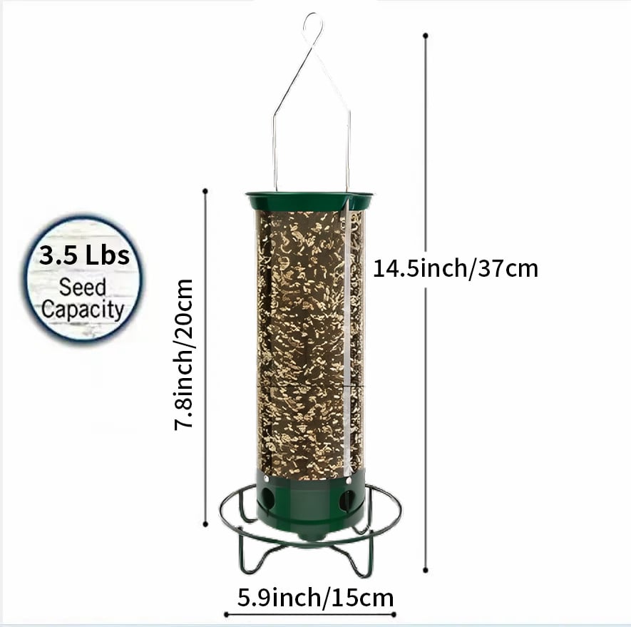 Our feeders are designed and calibrated to support the weight of large birds such as cardinals and woodpeckers. Still, they are not strong enough to support squirrels, which will immediately fall due to insufficient center of gravity. Additionally, the tight-fitting metal cover prevents squirrels from lifting the lid, while the long seed reservoir prevents them from reaching the port from above. With less competition from squirrels, birds won't be able to resist a visit!