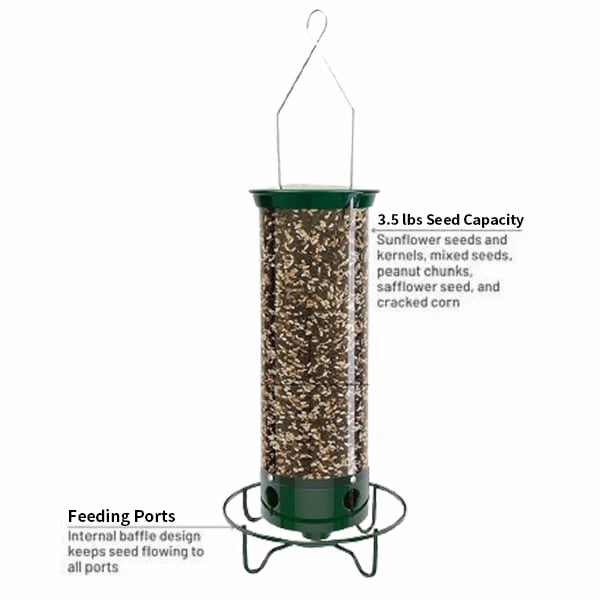 The feeder’s squirrel-proof design ensures less seed waste, which means money saved and fewer messes on the ground. Plus, the large 3.5 lb seed capacity ensures you won’t have to worry about birds emptying your feeder too quickly during peak feeding times. Convenient internal baffles also help to keep seed flowing freely to the ports as birds feed.