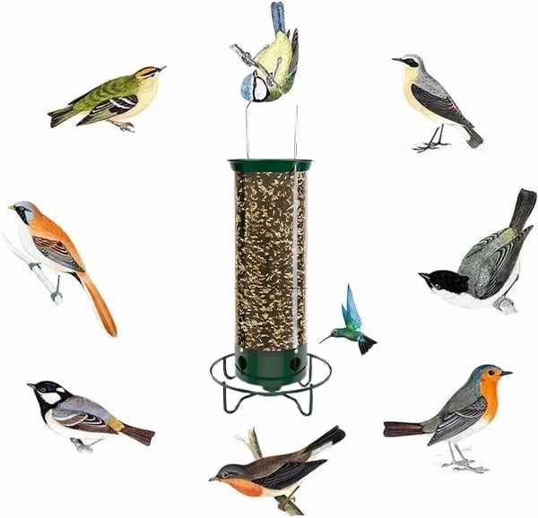 The tube bird feeder holds 3.5pounds of bird food and has four feeding openings and a circular perch, allowing multiple birds to feed simultaneously with a better view.